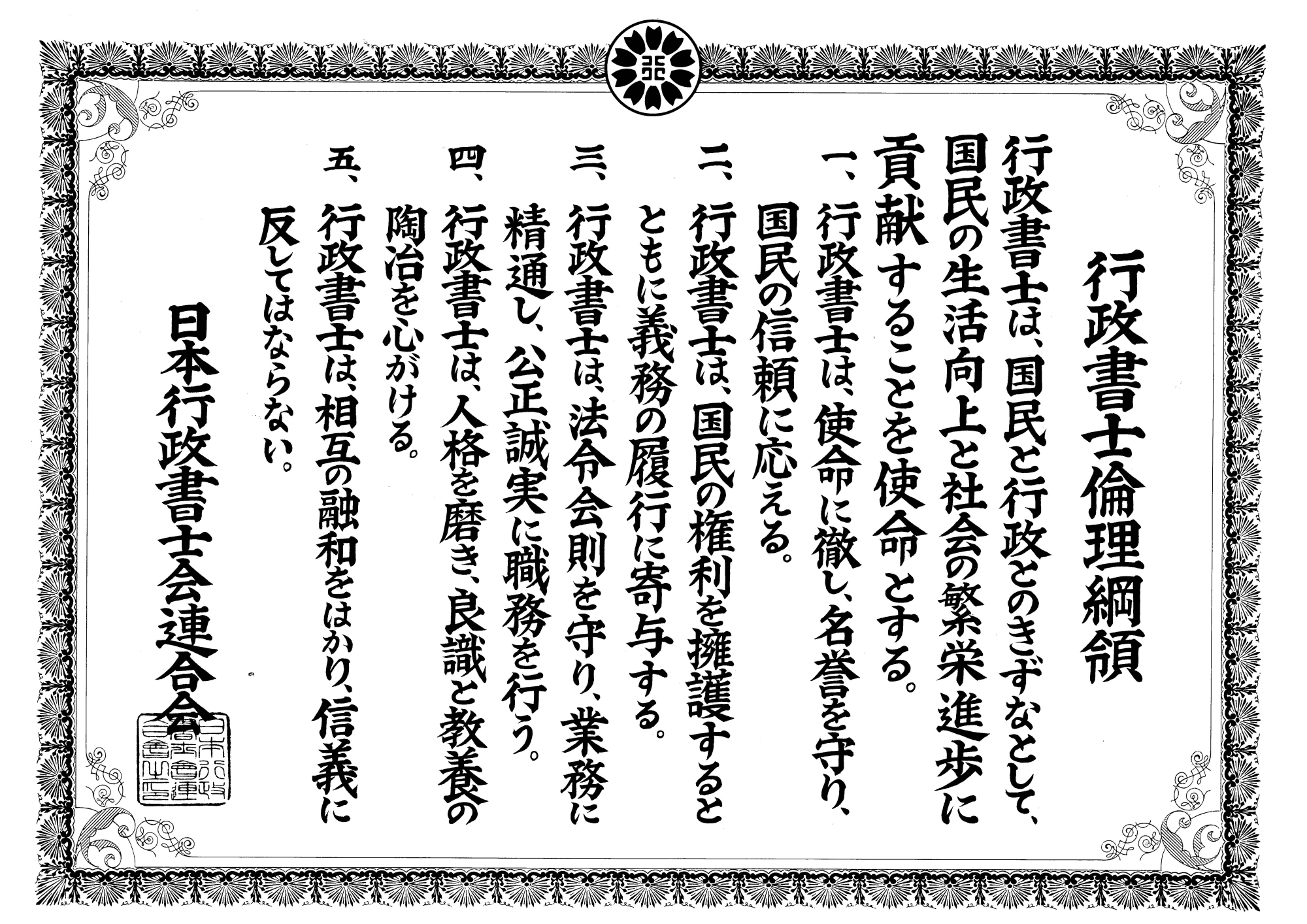 昭和54年11月30日、「行政書士会々員の倫理綱領」として制定され、その後、昭和61年7月18日、「行政書士倫理綱領」に名称を含め改訂されました。さらに、昭和63年4月、文学博士である金田一春彦先生に監修いただき改訂されたものが、現行の「行政書士倫理綱領」です。